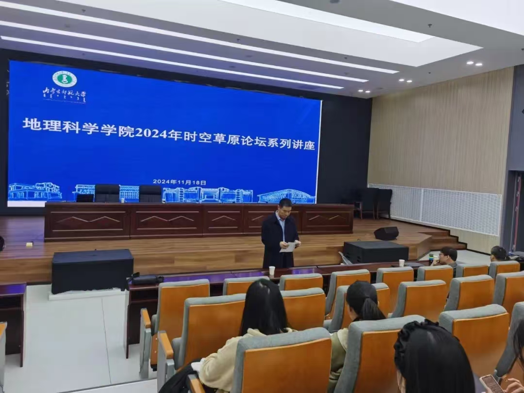 研究生素质与创新能力,增强研究生科研水平,2024年11月18日下午14:30,地理楼一楼报告厅开展了“时空草原论坛系列学术讲座”,本次会议主讲人为华东师范大学刘敏教授和李小飞研究员,报告题目分别为《地理学综合特征:环境地理学的挑战与展望》和《河口海岸湿地化能自养固碳促进铁结合有机碳形成》,由副院长萨楚拉主持,辅导员高苏日固嘎老师及2023、2024级全体研究生参与本次讲座。