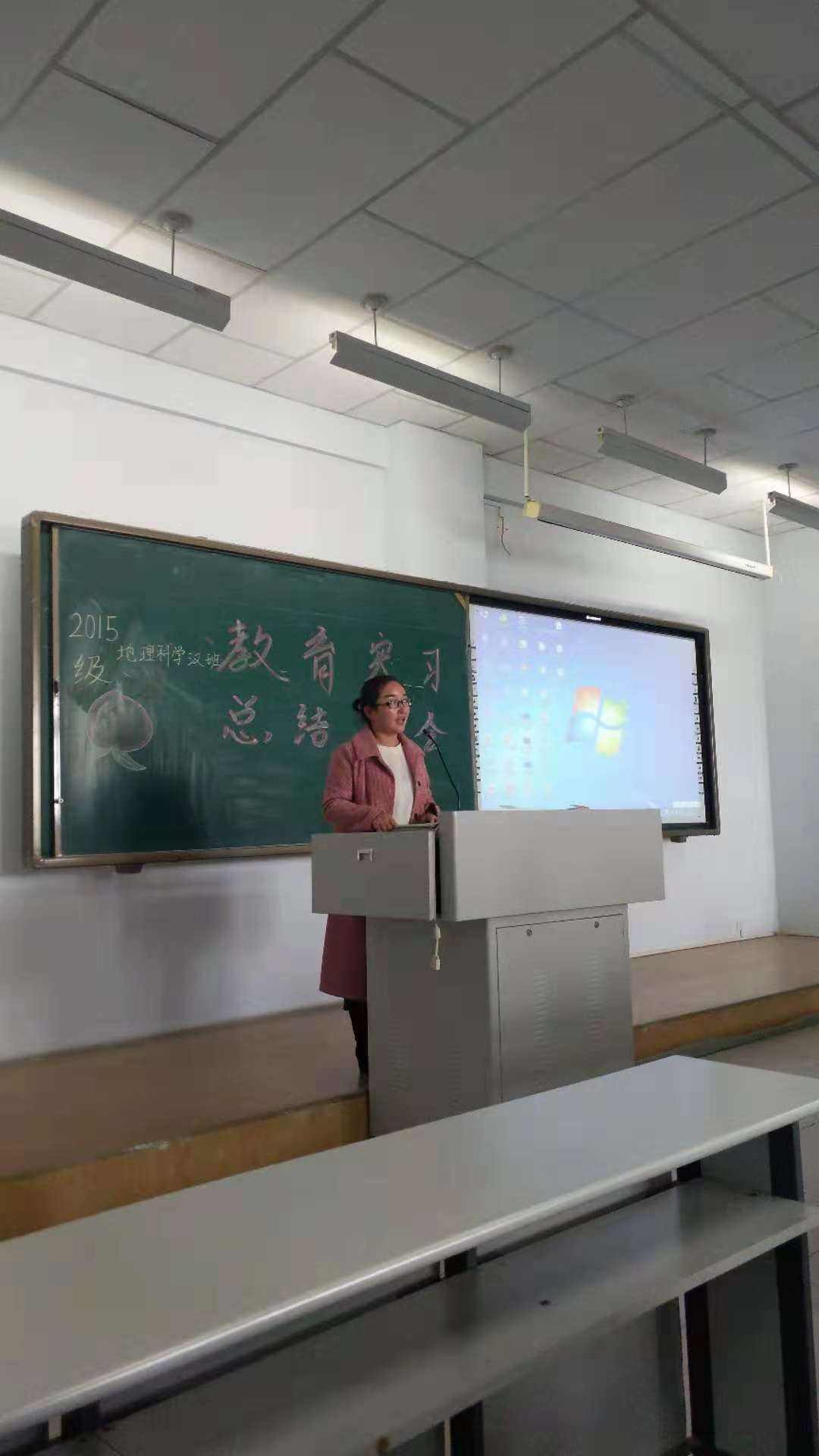 在赛罕校区行知楼308教室组织召开了2015级地理教育汉班教育实习总结大会。会议由实习指导教师赵伟主持,副院长王勇、地理科学系主任乌敦、博士生导师银山、2015和2016级地理教育汉班全体学生参加了会议。