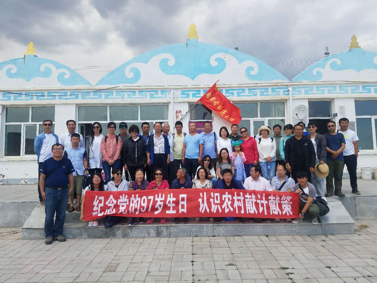 参加活动的全体教师在红旗庙嘎查的村委会前,拉起“纪念党的97岁生日,认识农村献计献策”横幅,合影留念,与嘎查孔书记等进行座谈,孔书记介绍了嘎查基本情况和精准扶贫现状,特别介绍了2014年至今,内蒙古师范大学完成的教育扶贫、产业扶贫的进展情况,说球帝app