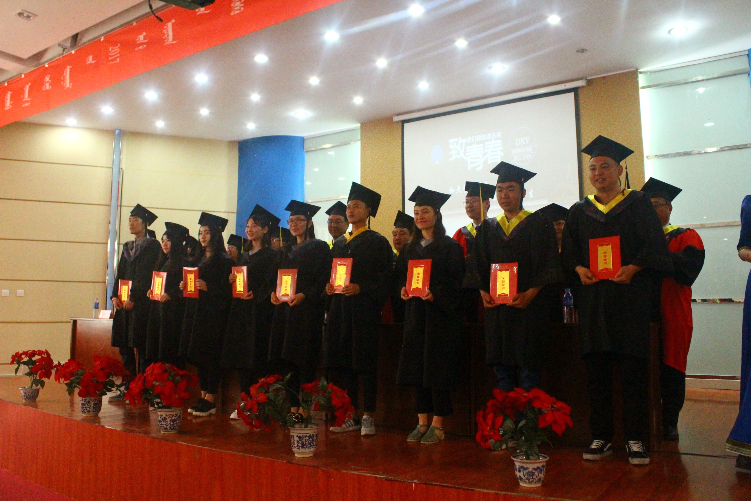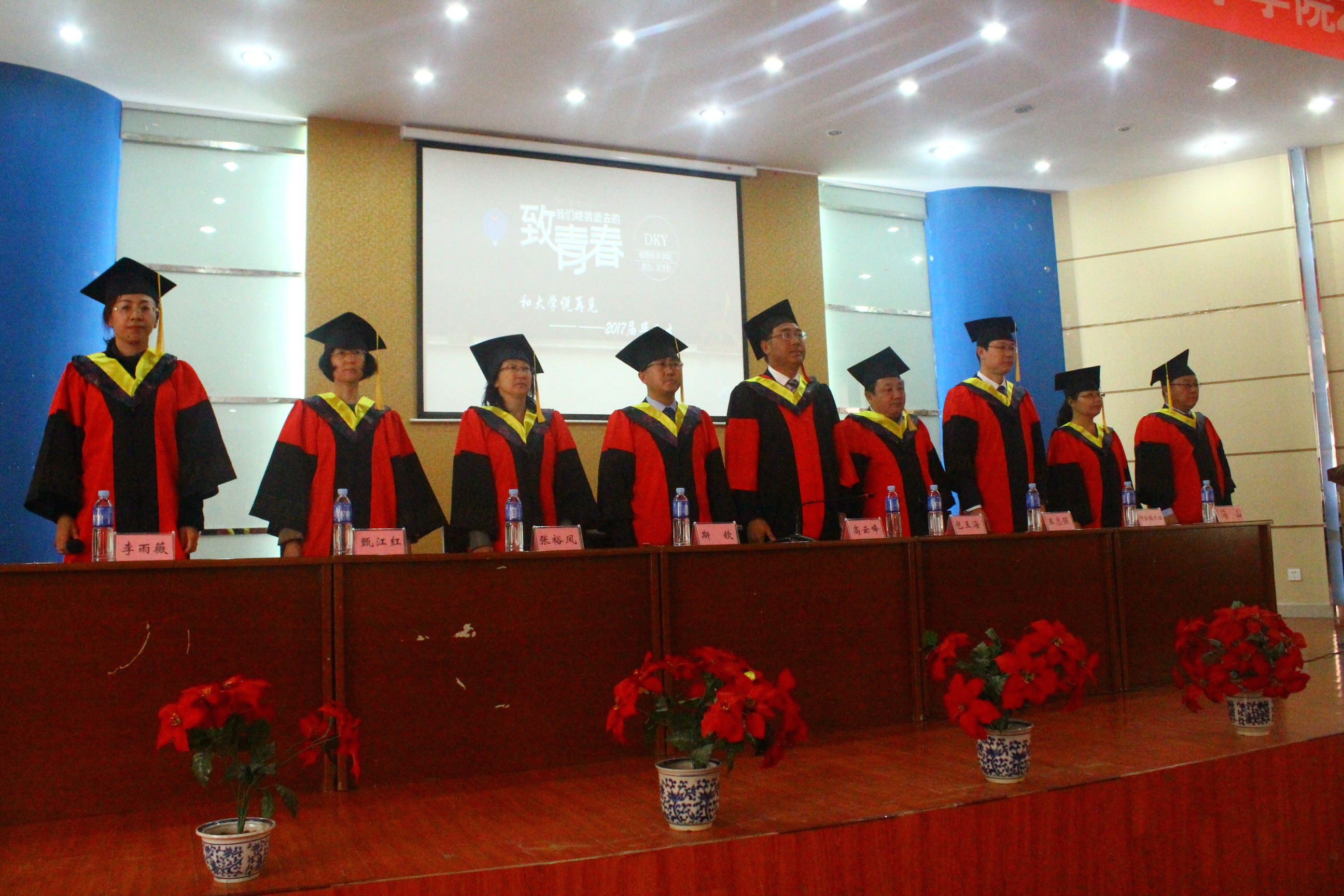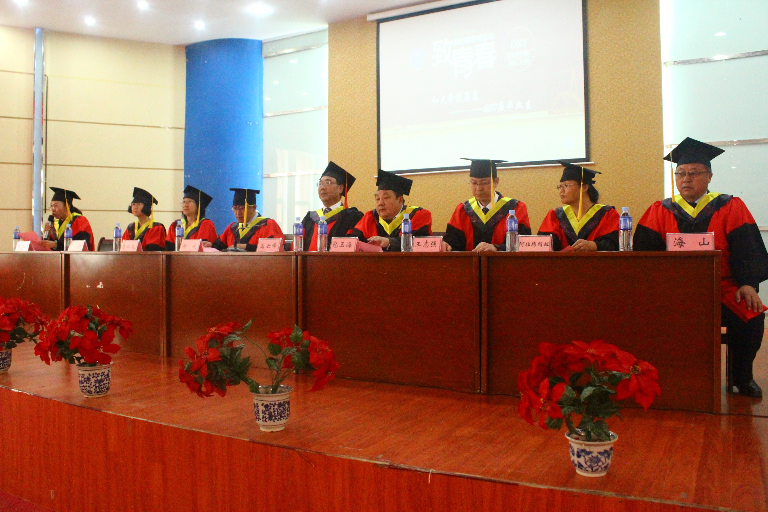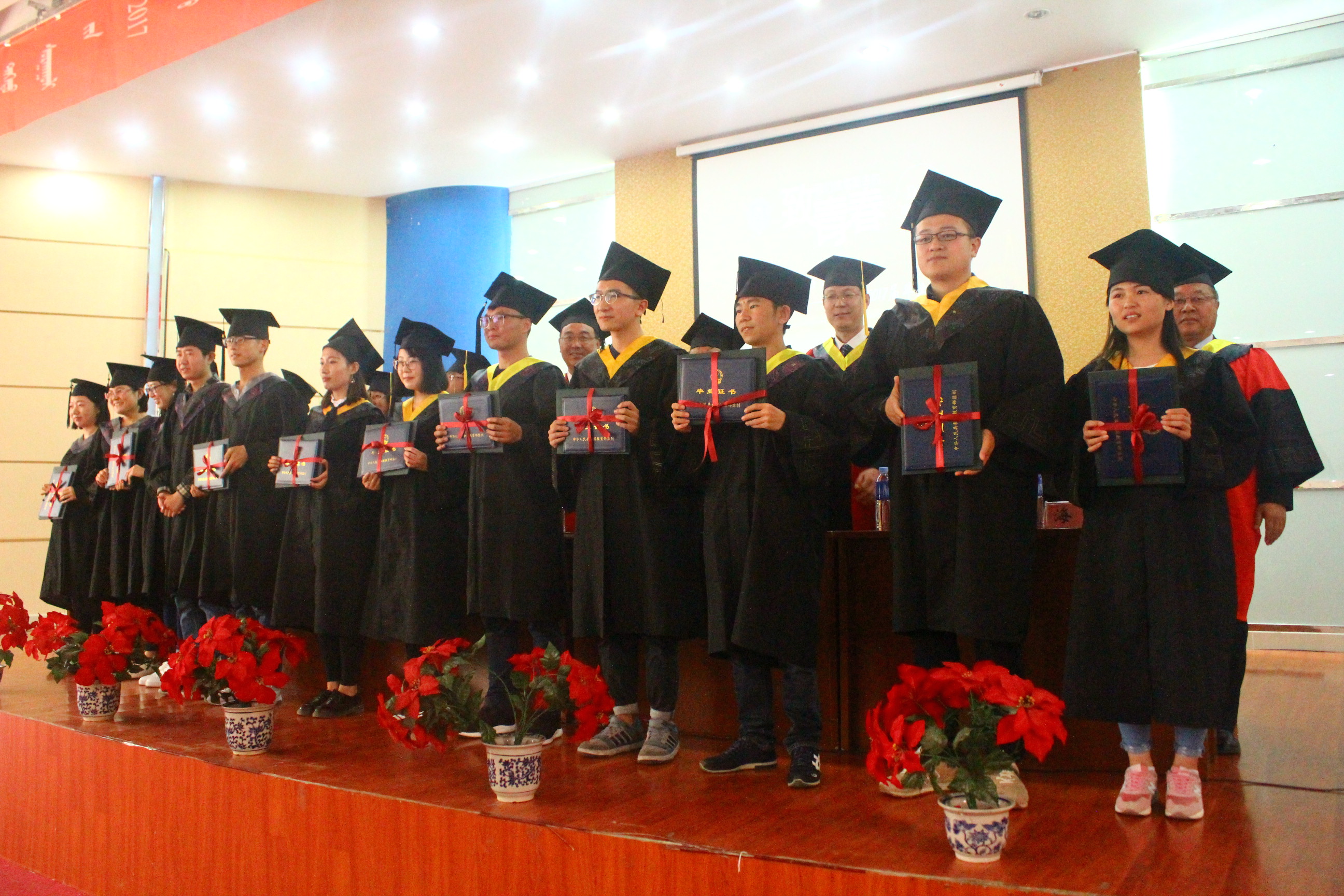 2017届本科生毕业典礼在内蒙古师范大学“校歌”的歌声中圆满落幕,出席典礼的全体领导和毕业生亲切合影留念。
