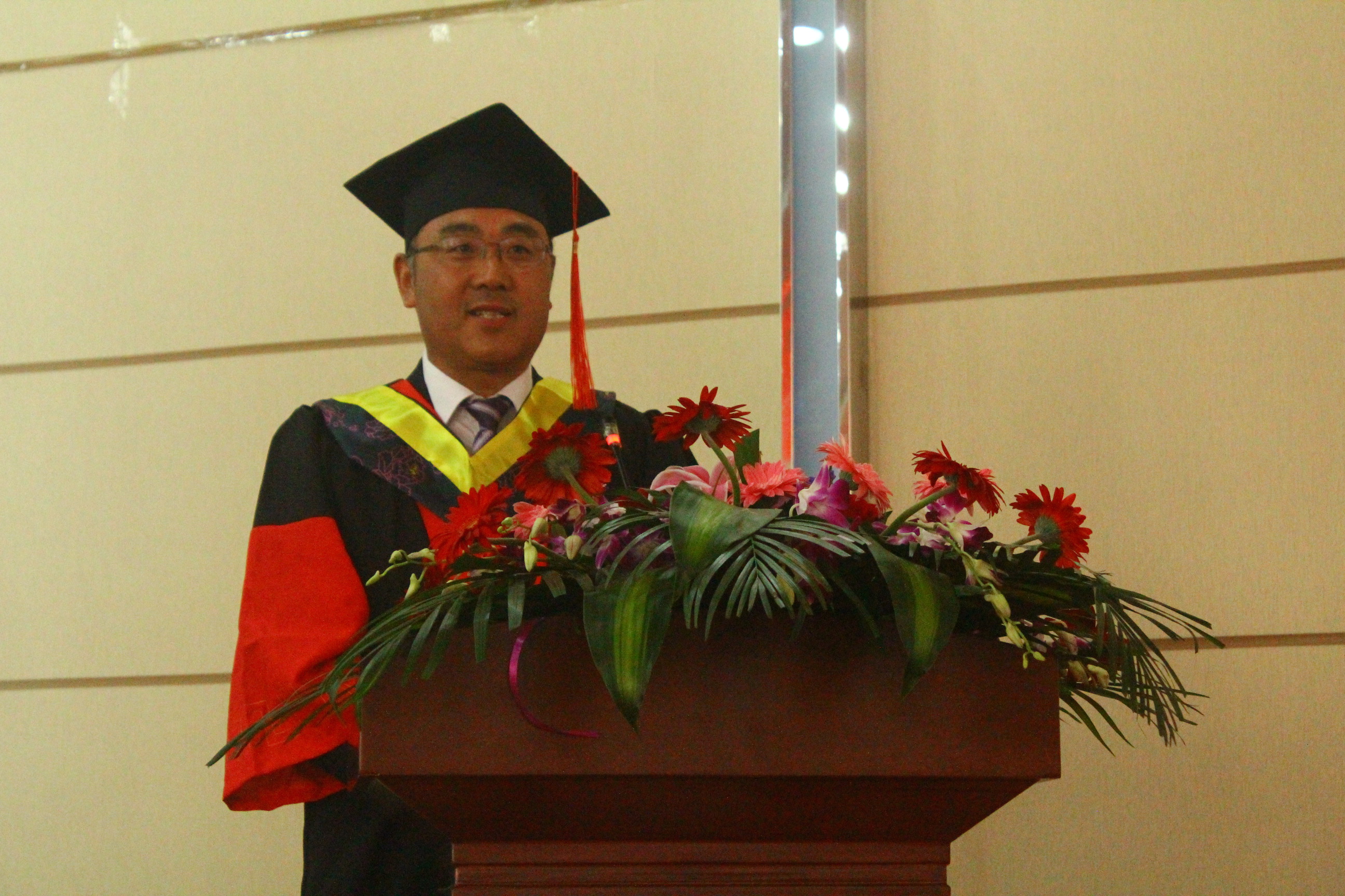 党委副书记、纪委书记高云峰研究员代校领导致辞,并从三个方面给全体毕业生予以嘱咐和期望:1.学习永远没有毕业。求知是光明的旅程,只有起点没有终点,只有通过学习才能紧跟时代的步伐,永远记住淘汰你的是时代而不是你的竞争对手。要让学习成为一种习惯,成为一种精神追求,不仅仅是学习书本上的知识,更应该向他人学习。学会学习,没有学习的艰辛,不会有成功,要时刻记住成功靠学习。2.永不言弃。生活远比我们想象的艰难苦涩,走出校园不仅仅是吃不到了一天25块的饭菜 一年900块的宿舍,更找不到的是那些为你付出的老师和同学们,一切靠我们自己。当我们身临困境时,要告诉自己再坚持一下,阳光总在风雨后,生活的美好要有耐心去等待。3.不要抱怨,无论顺境逆境永远不要抱怨自己的命运,一切都是最好的安排,所有的失败都是为了更好的美好到来腾出地方,所有的低头弯腰都是为高高跃起做准备,所有的破碎都是为了那个来之不易的圆满。他还说:“同学们,母校永远是你们的精神家园,无论何时、无论何地,母校都在注视你前进的脚步、奋斗的身影。作为老师衷心祝愿走出校园的你们依然踌躇满志、依然基情四射、依然心怀梦想,因为有你,母校有更多荣耀时刻被点亮;因为有你,母校有更多美好的故事到处传唱。再见了同学们!一生平安、永远平安,这是老师对你们永远的祝愿!”