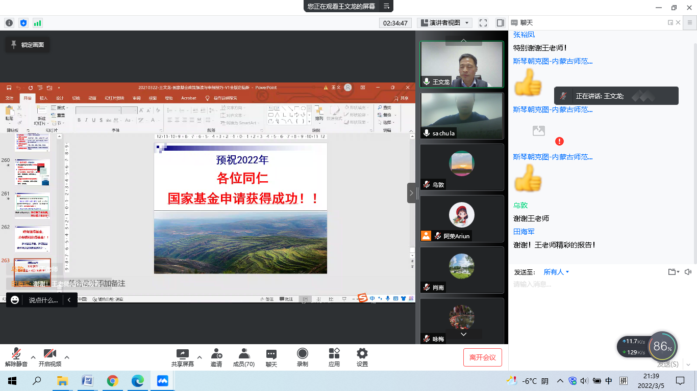 教师分享国家自然科学基金政策的新变化以及申请书的撰写技巧。讲座采用腾讯会议方式进行,由副院长萨楚拉老师主持,书记张裕凤、院长包玉海及近70名老师和博士研究生听取了报告。