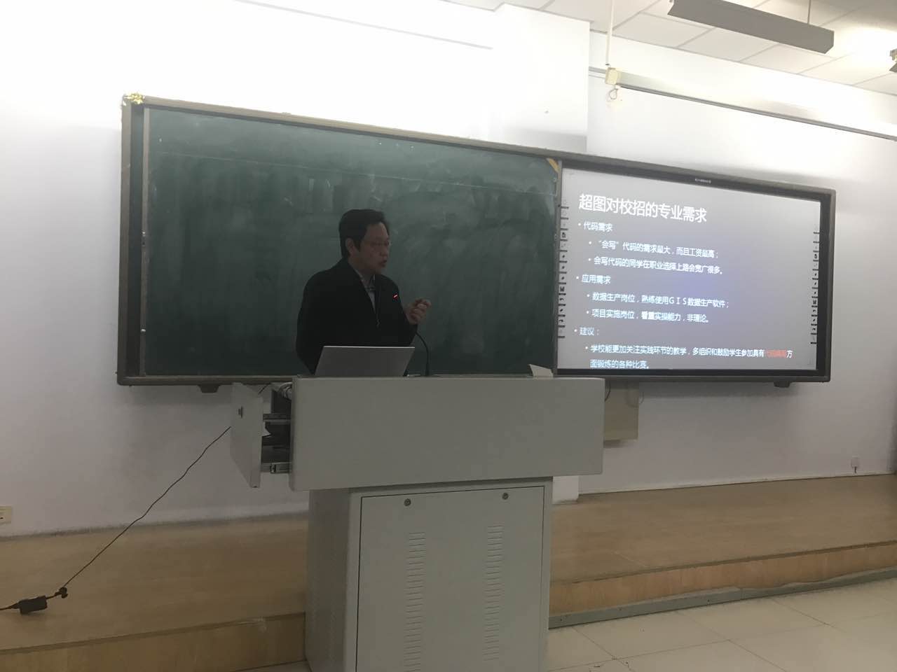 2017年4月26日上午9:00时,北京超图软件股份有限公司代表到我院进行了企业GIS人才需求分析、洞察与远见-大数据时代的GIS软件发展两个专题报告。报告由北京超图呼和浩特分公司销售经理都业军经理主持,我院院长包玉海教授、院长助理银山教授、地理系主任阿拉腾图亚老师及团总支书记胡日查老师以及学院GIS专业近100名同学听取了本次报告。同时,包玉海院长在报告过程中与超图公司代表就部分报告内容进行了交流。