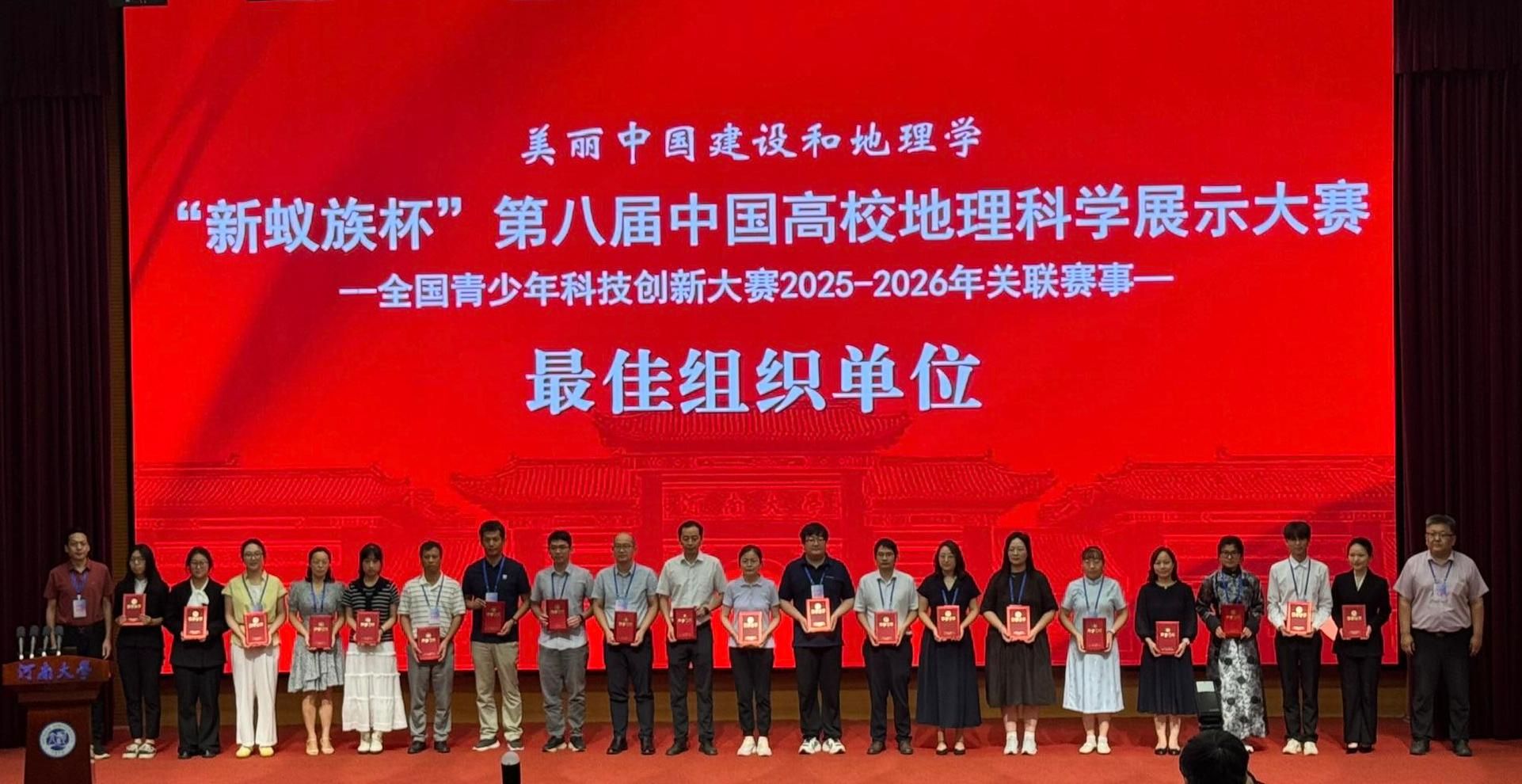 2025年7月25日至27日,“新蚁族杯”第八届中国高校地理科学展示大赛全国总决赛在河南大学(开封)成功举办。我院“绿原守望者队”参与人文地理组别展示。经过多轮激烈角逐,最终斩获人文地理团体一等奖。与此同时,我院凭借优异的组织表现,荣获“最佳组织单位”称号。