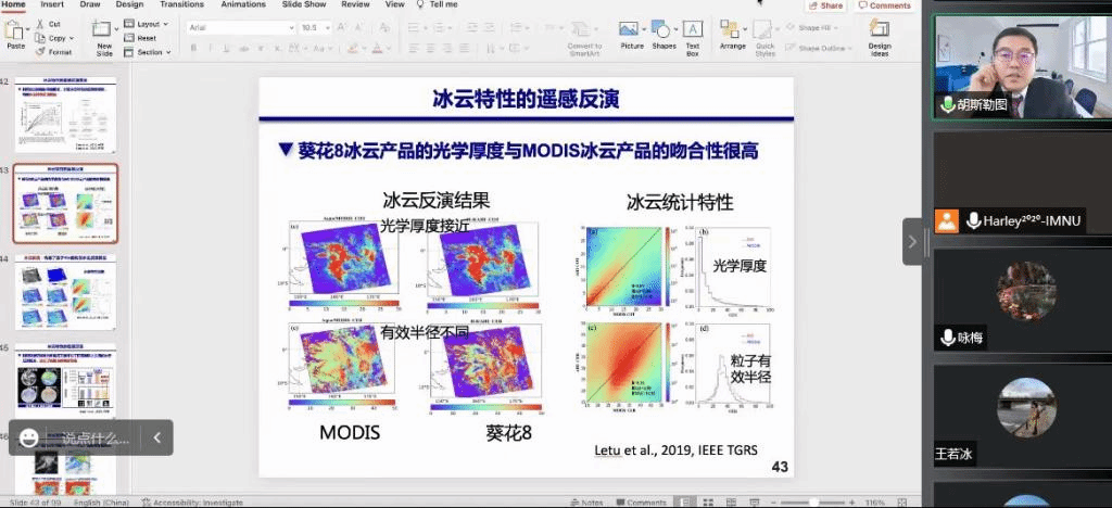 讲座中,胡斯勒图博士阐释了利用葵花8和云4新一静止卫星资料构建全天时云雾霾检测和相态识别新算法,进一步结合红外多通道资料构建云顶参数反演算法及产品;开发新的冰晶光散射模型,应用于冰云微物理特性反演和冰云辐射强迫的模拟中;利用上述云宏微观参数反演结果,结合辐射传输理论构建地表下行长短波辐射,光合有效辐射和紫外辐射通量估算算法,进一步结合地面观测资料和 CERES 卫星产品验证其精度,得到很好的计算精度等研究内容,为我院师生打开学术新视野,得到了积极好评。
